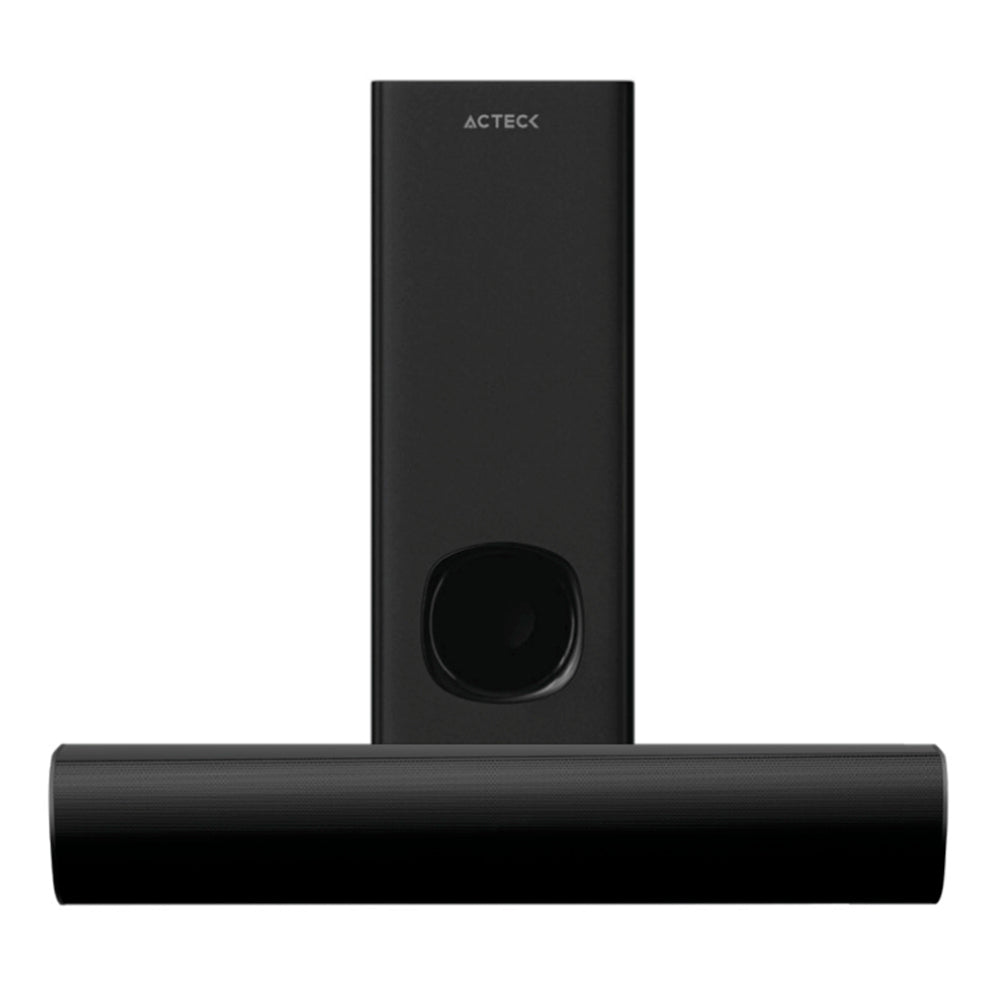 | Acteck BS465. Canales de salida de audio: 2.1 canales, Potencia estimada RMS: 60 W. Potencia de la barra de sonido del altavoz RMS: 30 W, Frecuencia de crossover: 6 Hz, THD, distorsión armónica total: 2%. Potencia RMS de subwoofer: 30 W, Rango de frecuencias de subwoofer: 45 - 400 Hz, Impedancia de subwoofer: 4 Ohmio. Color del producto: Negro. Tecnología de conectividad: Inalámbrico y alámbrico |